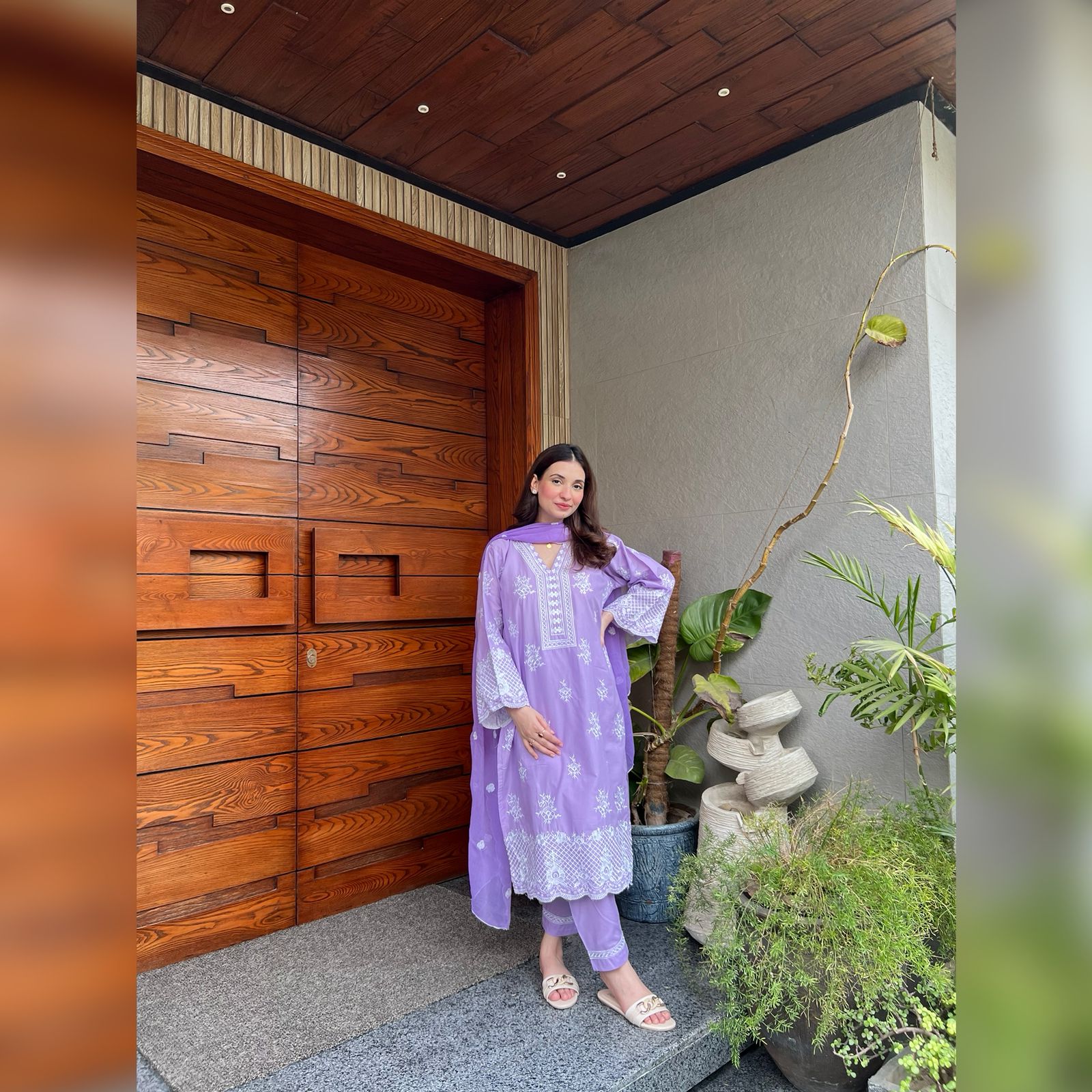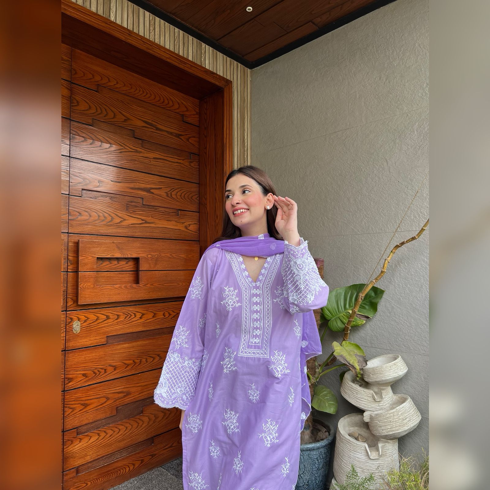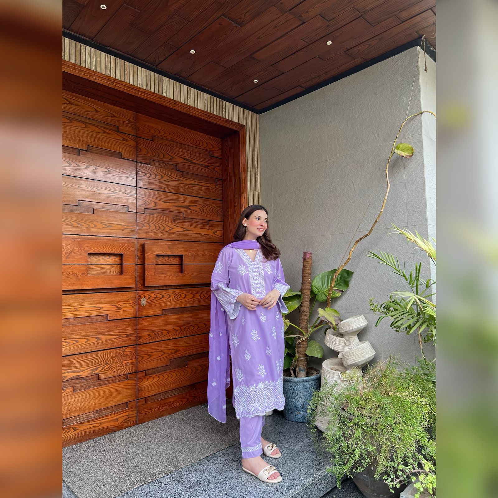 Embrace grace and elegance with this stunning lilac embroidered three-piece stitched outfit. Perfect for any occasion, it blends traditional craftsmanship with modern style. Available now at Ms Clothing Brand. 💜